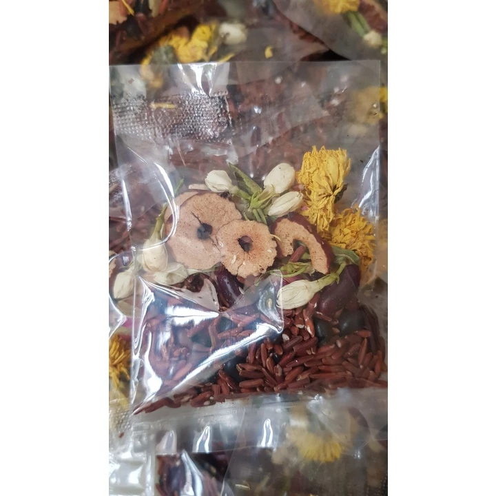 – Gạo nứt và đậu đen xanh lòng đã được rang chín, cùng với thảo mộc cỏ ngọt, hoa nhài, hoa cúc, hoa hồng, táo đỏ, hoa đậu biếc, hoa atiso giúp tạo cảm giác no lâu, không thèm ăn.